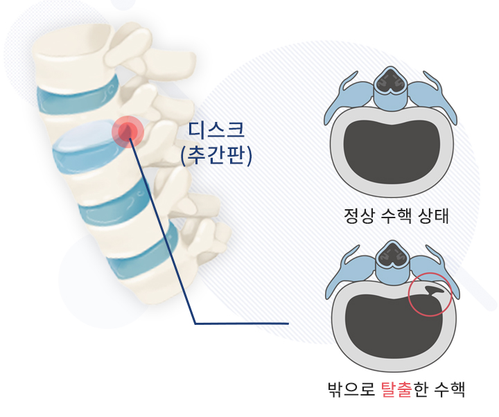 허리의 무리한 사용이나 잘못된 자세, 퇴행성 변화 등으로 인하여 디스크 안에 있는 수핵이 밖으로 탈출해 신경을 누르게 되어 통증을 유발하는 것을 허리디스크(추간판 탈출증)라고 합니다.