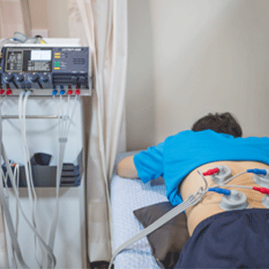 진통효과를 위해 통각에 관여하는 감각신경을 저주파와 중주파 전류를 이용하여 자극하는 경피신경전기자극치료(TENS), 간섭파치료(ICT) 입니다.